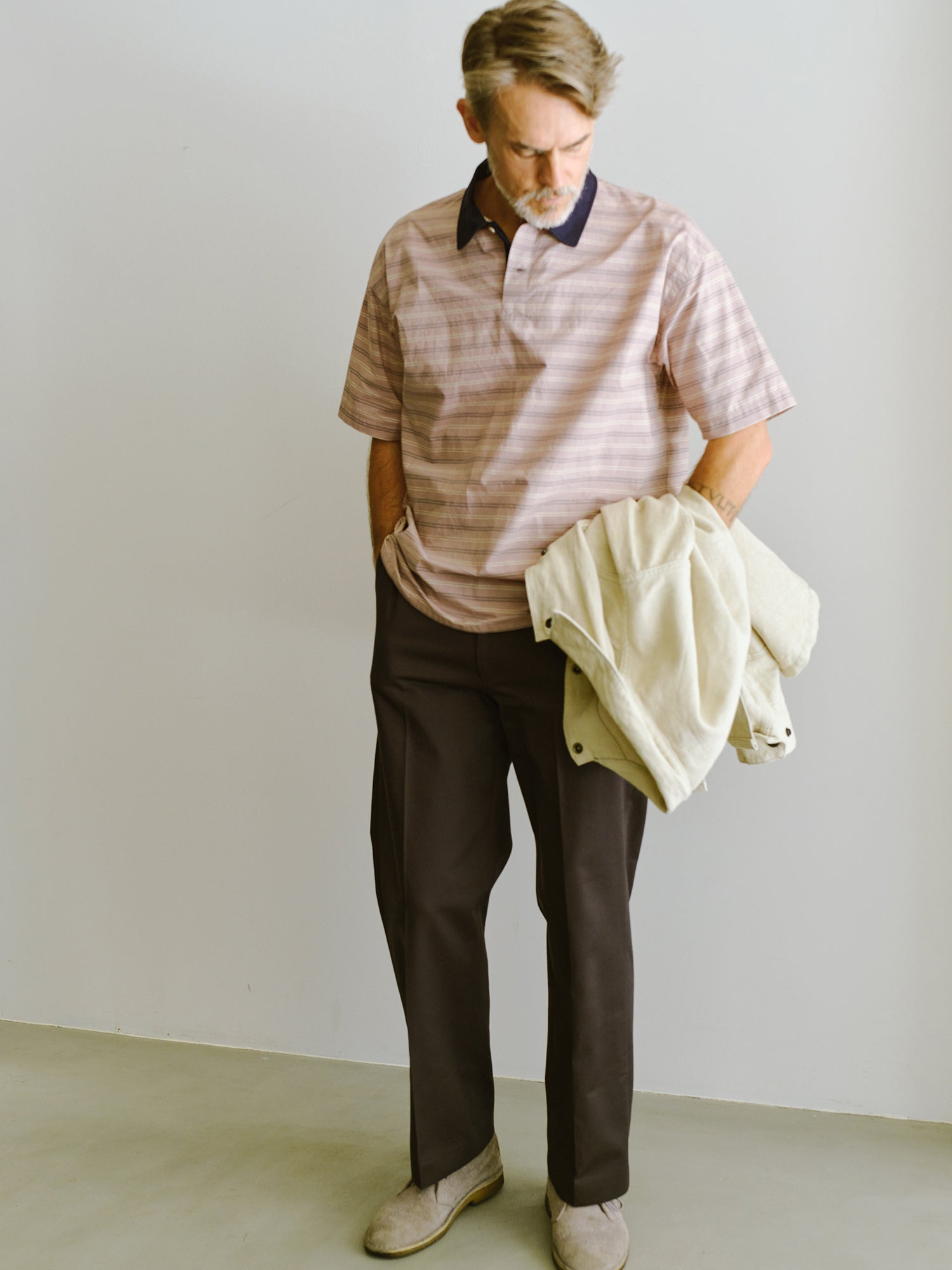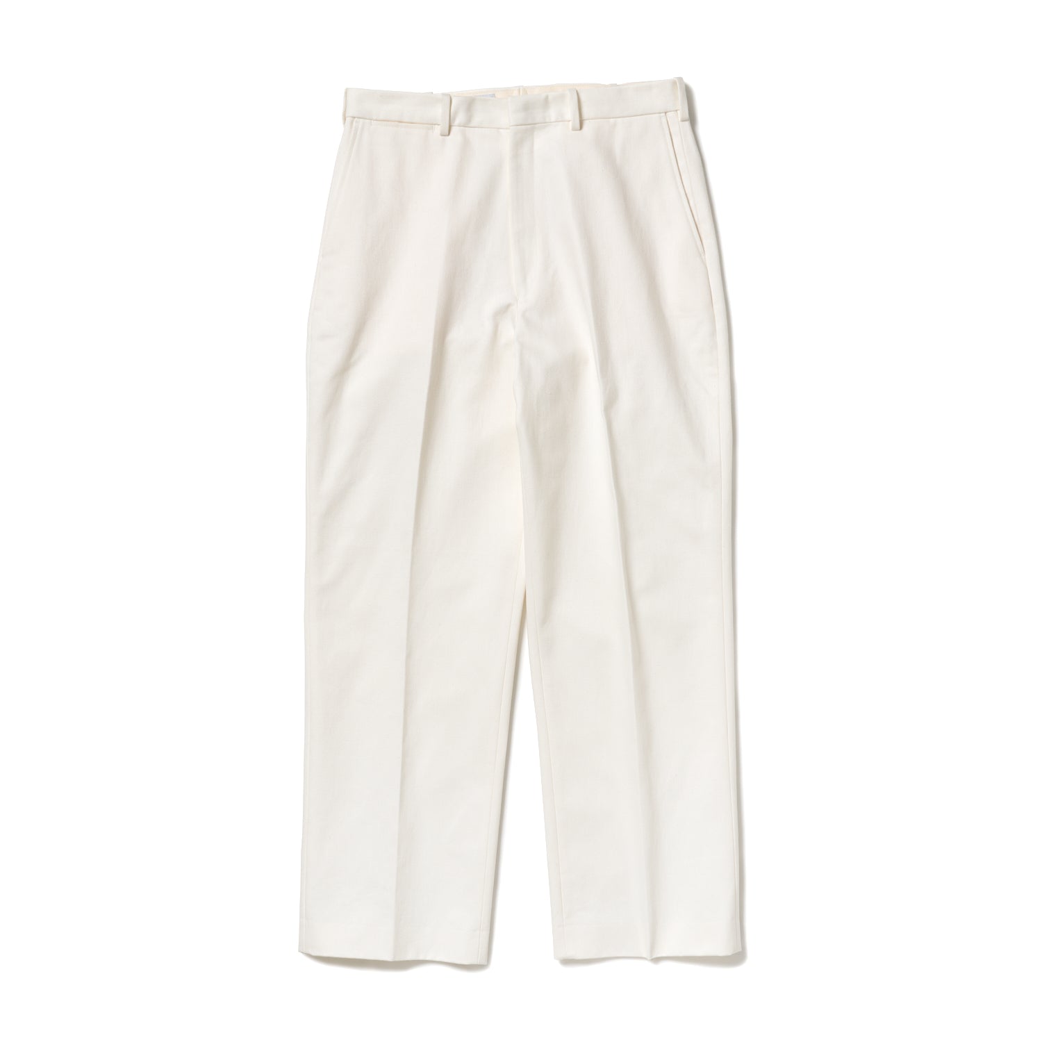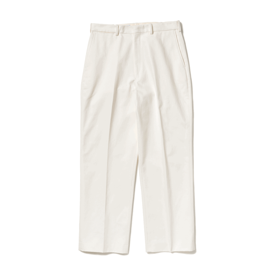 ワイドシルエットながら腰廻りをすっきり仕上げた新型チノパン。ブランドを立ち上げて10年が経ち、初の(?)屋号が入ったアイテムを製作。