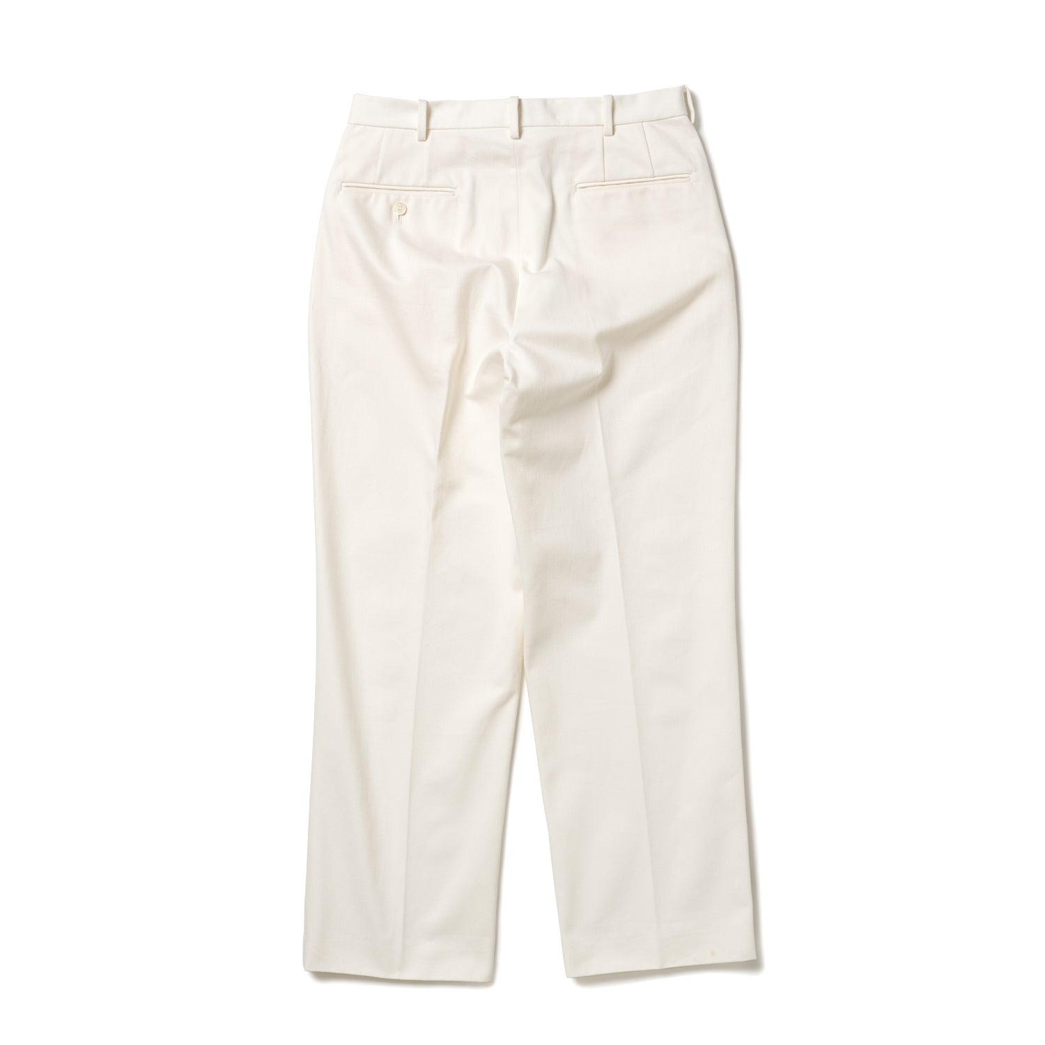 深めの股上に程よくフィットした尻廻り。広めのワタリ巾。そこから裾まで直線的にストンと落としたワイドストレート型に仕上げています。ヒップの極細の玉縁ポケット上にはダーツを2本入れ、スラックスを穿いた際にお尻が吊り上がって見える構造。パンツは後ろ姿までクールなものに惹かれます。