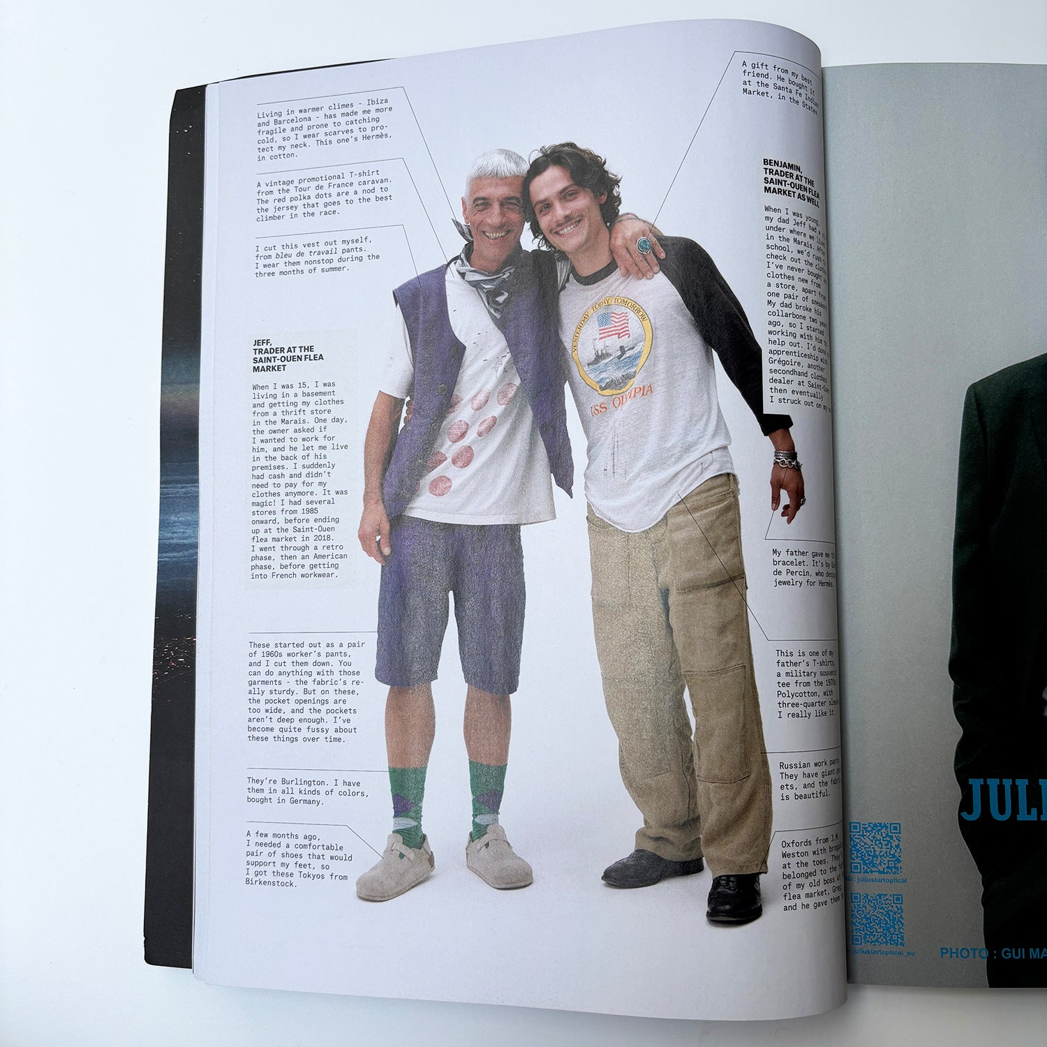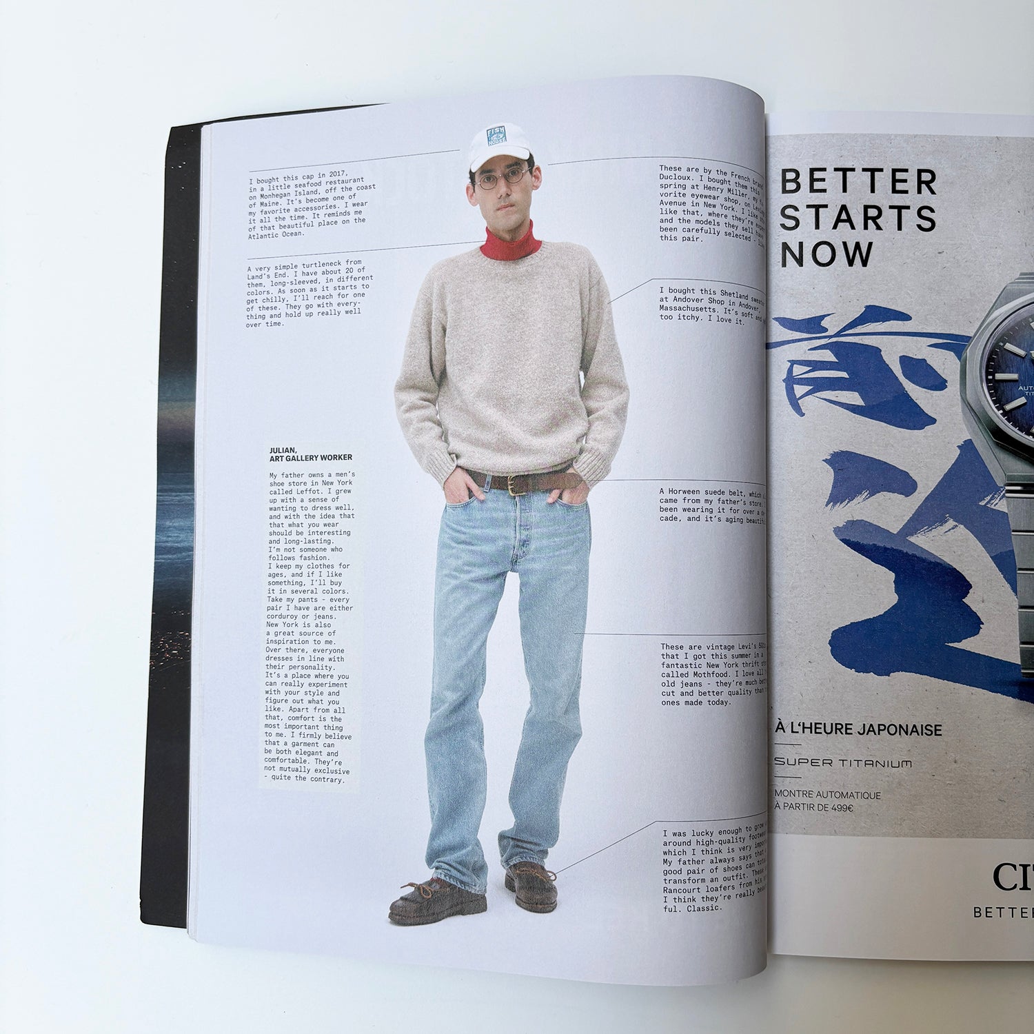 ISSUE15となる今号は、定番企画のクリエイターの私服紹介から始まります。サン・トゥアン(クリニャンクール)蚤の市でセカンドハンドショップを営む親子のコーディネートや、アートギャラリーで働く男の子のスタイルが◎