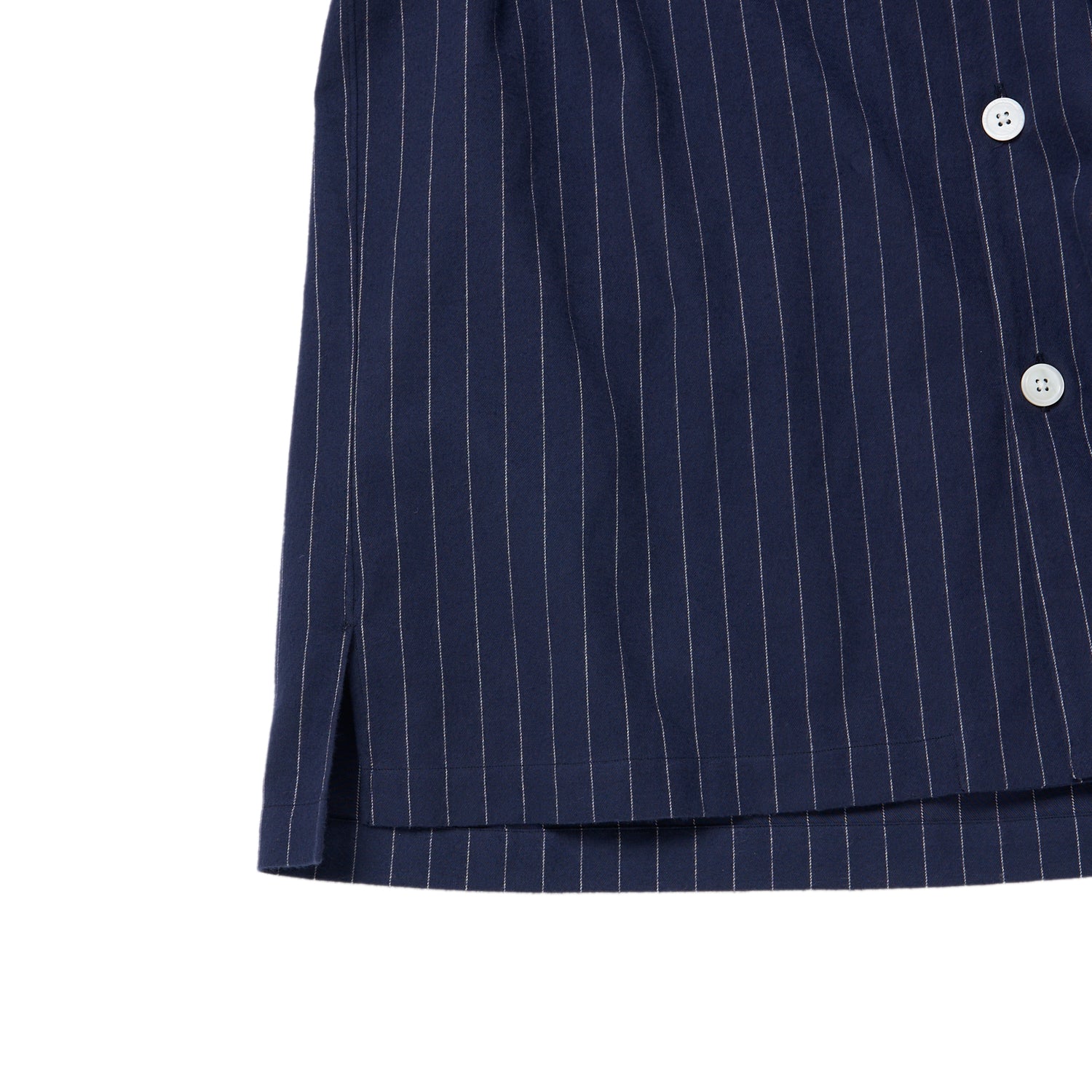 ドレスシャツの縫製工場に制作依頼し3cm間24針というとても細かい運針。脇は折り伏せ縫いと呼ばれる生地端が見えない縫い方で5mm巾にて始末。パジャマとは思えない品のある仕上がり。ボタンには白蝶貝ボタンを使用。